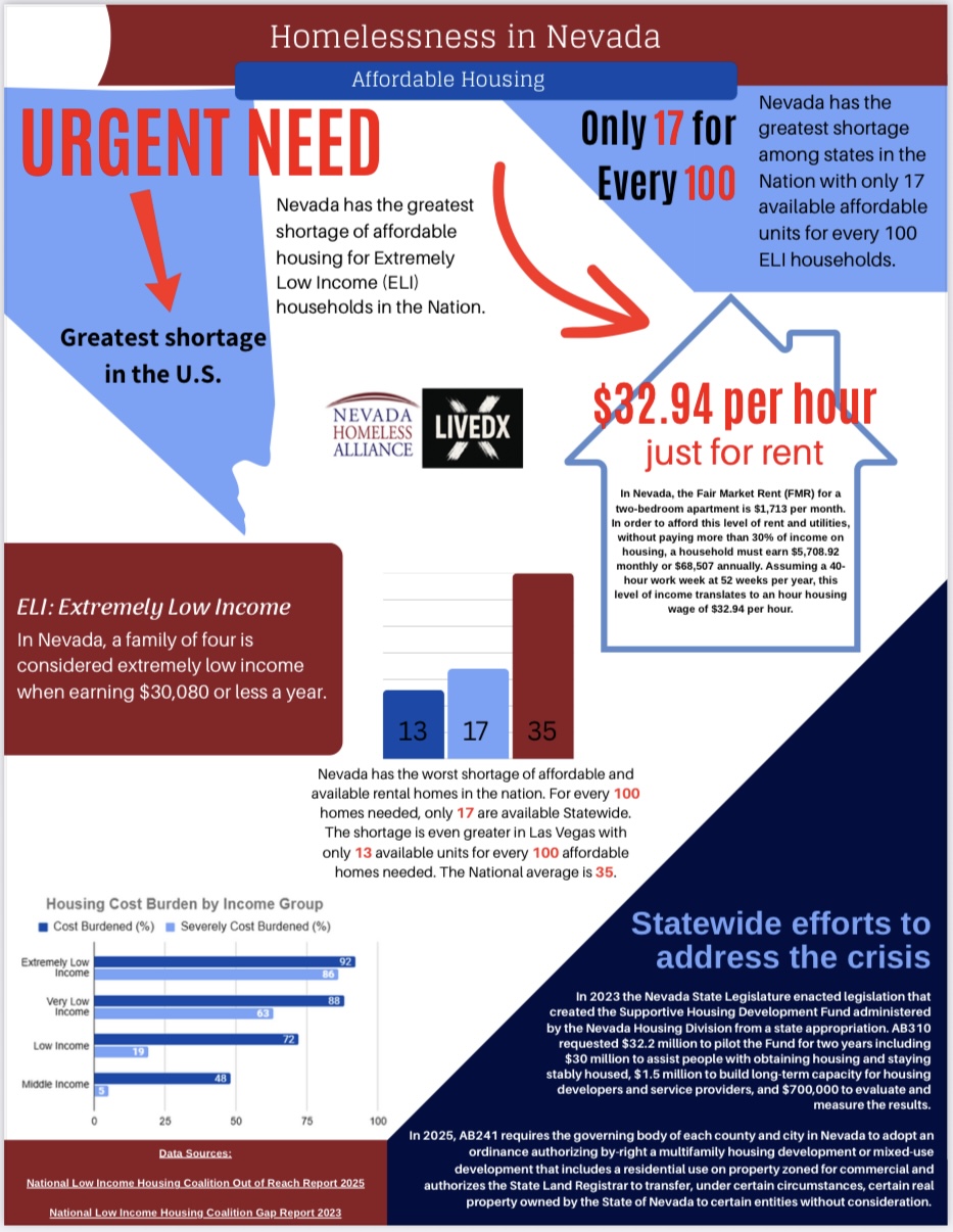 On any given night, there are 6,566 individuals experiencing homelessness in Southern Nevada and 16,251 Southern Nevadans, including families with children, couples, and individuals of all ages, who will experience homelessness at some point this year (Southern Nevada Homeless Census and Survey, 2023)