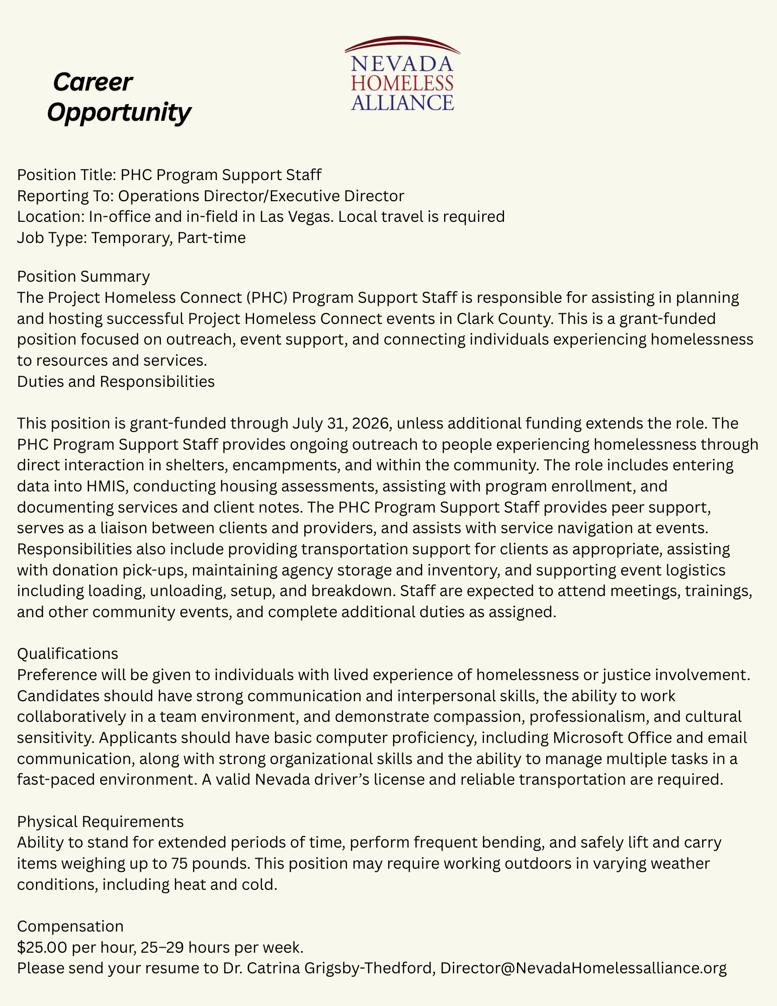 The Nevada Homeless Alliance is seeking a temporary, part-time PHC Program Support Staff based in Las Vegas, Nevada. This position supports Project Homeless Connect (PHC) efforts by assisting with outreach, event coordination, and service navigation for individuals experiencing homelessness throughout Clark County. This is a grant-funded position expected to run through July 31, 2026.